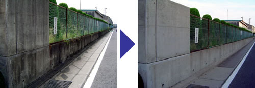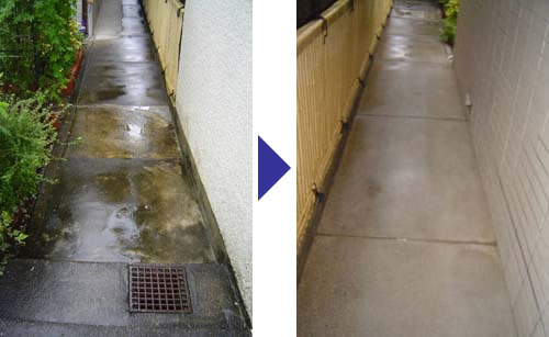 門柱、ブロック塀、コンクリート塀、駐車場床部、玄関タイル、エントランスの洗浄、白華(エフロ)除去、防汚加工などを行います。